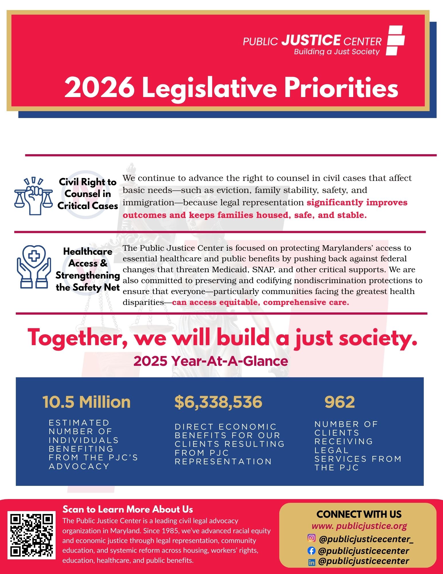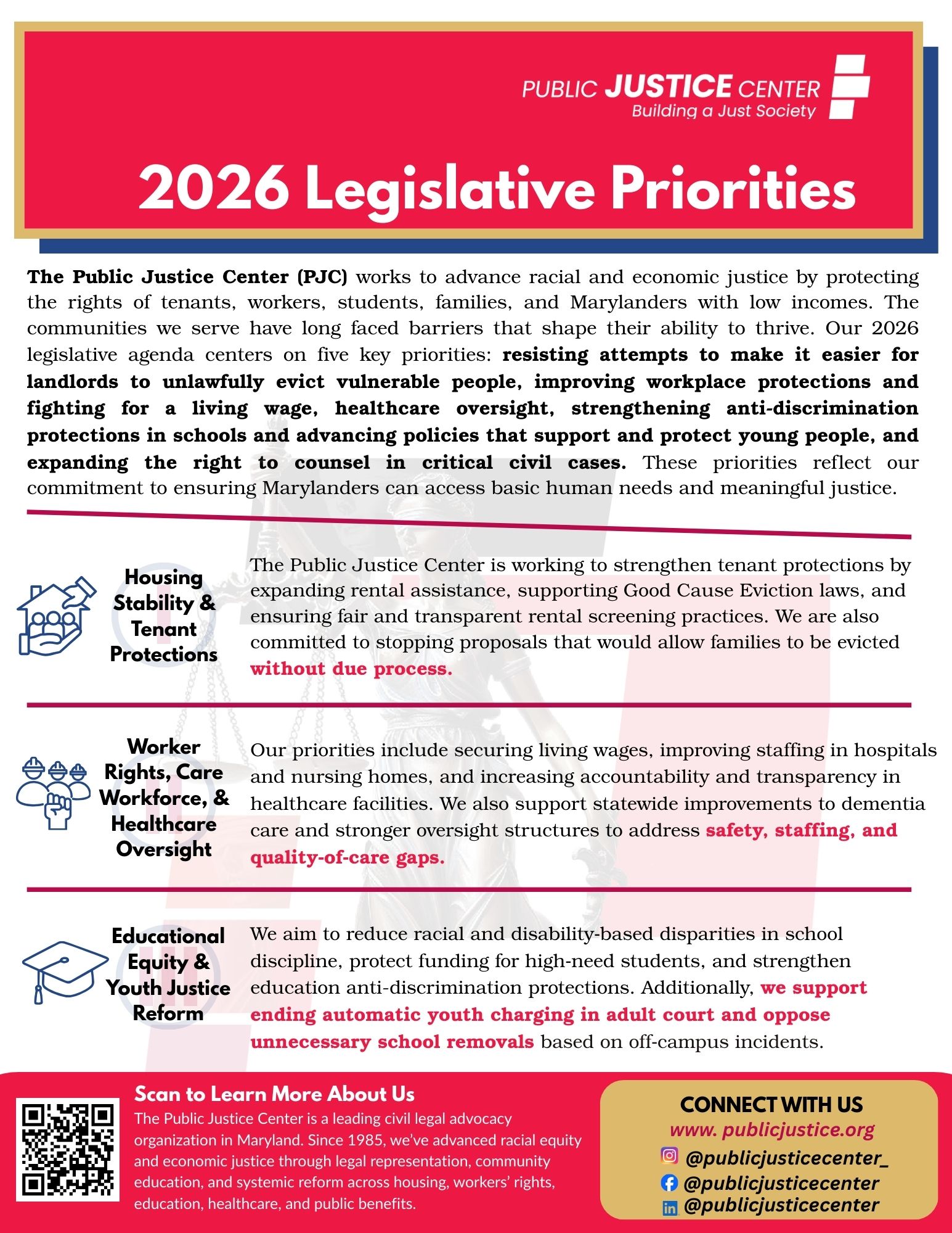 The 2026 session of the Maryland General Assembly has begun! In the coming weeks, we’ll be advocating to promote economic justice and race equity on a number of fronts. We invite you to check out state legislative priorities from our Human Right to Housing Project, Workplace Justice Project, Education Stability Project, and Health and Benefits Equity Project teams, as well as legislation from across the country that our National Coalition for a Civil Right to Counsel team is following. Stay tuned for ways to take action! You can sign up for action alerts via email and text message, and follow us on Facebook, Instagram, and LinkedIn.